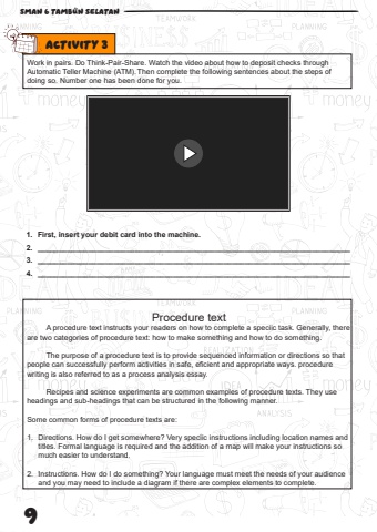 9 SMAN 6 TAMBUN SELATAN Work in pairs. Do Think-Pair-Share. Watch the video about how to deposit checks throughAutomatic Teller Machine (ATM).Then complete the following sentences about the steps of doing so. Number one has been done for you.Procedure textA procedure text instructs your readers on how to complete a speciic task. Generally, there are two categories of procedure text: how to make something and how to do something.The purpose of a procedure text is to provide sequenced information or directions so that people can successfully perform activities in safe, eficient and appropriate ways. procedure writing is also referred to as a process analysis essay.Recipes and science experiments are common examples of procedure texts. They use headings and sub-headings that can be structured in the following manner.Some common forms of procedure texts are:1. Directions. How do I get somewhere? Very speciic instructions including location names and titles. Formal language is required and the addition of a map will make your instructions so much easier to understand.2. Instructions. How do I do something? Your language must meet the needs of your audience and you may need to include a diagram if there are complex elements to complete.Activity 31. First, insert your debit card into the machine.2. __________________________________________________________________________3. __________________________________________________________________________4. __________________________________________________________________________