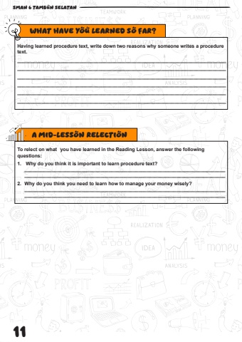 11 SMAN 6 TAMBUN SELATAN What Have You Learned So Far? A Mid-Lesson RelectionHaving learned procedure text, write down two reasons why someone writes a procedure text.______________________________________________________________________________________________________________________________________________________________________________________________________________________________________________________________________________________________________________________________________________________________________________________________________________________________________________________________________________To relect on what you have learned in the Reading Lesson, answer the following questions:1. Why do you think it is important to learn procedure text? ____________________________________________________________________________________________________________________________________________________2. Why do you think you need to learn how to manage your money wisely? ____________________________________________________________________________________________________________________________________________________