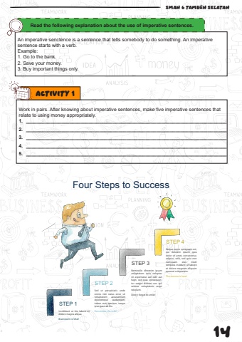 14 SMAN 6 TAMBUN SELATAN STEP 1Incididunt ut itte labore et dolore magna aliqua. Brainstorm is Vital!STEP 2Sed ut perspiciatis unde omnis iste natus error sit voluptatem accusantiumdoloremque laudantium, totam rem aperiam, eaque ipsa quae ab illo.Remember the milk!STEP 3Four Steps to SuccessNemostilo dheenim ipsamvoluptatem quia voluptas sit aspernatur aut odit aut fugit, sed quia consequuntur magni dolores eos qui ratione voluptatem sequi nesciunt. Dont t forget to smile!STEP 4Neque porro quisquam est,qui dolorem ipsum quia dolor sit amet, consectetur, adipisci velit, sed quia non numquam eius modi tempora incidunt ut labore et dolore magnam aliquamquaerat voluptatem.The success is here!An imperative senctence is a sentence that tells somebody to do something. An imperative sentence starts with a verb.Example:1. Go to the bank.2. Save your money.3. Buy important things only.Read the following explanation about the use of imperative sentences.Work in pairs. After knowing about imperative sentences, make five imperative sentences that relate to using money appropriately.1. __________________________________________________________________________2. __________________________________________________________________________3. __________________________________________________________________________4. __________________________________________________________________________5. __________________________________________________________________________Activity 1