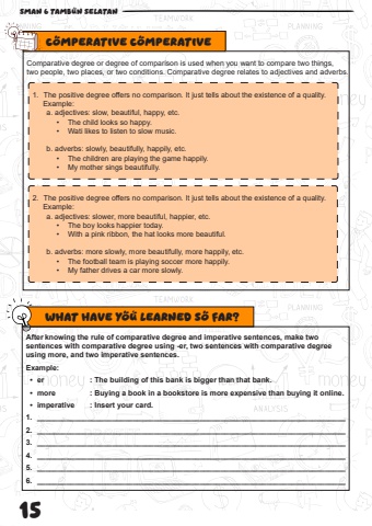15 SMAN 6 TAMBUN SELATAN Comparative degree or degree of comparison is used when you want to compare two things, two people, two places, or two conditions. Comparative degree relates to adjectives and adverbs.COMPERATIVE COMPERATIVE1. The positive degree offers no comparison. It just tells about the existence of a quality.Example:a. adjectives: slow, beautiful, happy, etc.%u2022 The child looks so happy.%u2022 Wati likes to listen to slow music.b. adverbs: slowly, beautifully, happily, etc.%u2022 The children are playing the game happily.%u2022 My mother sings beautifully.2. The positive degree offers no comparison. It just tells about the existence of a quality.Example:a. adjectives: slower, more beautiful, happier, etc.%u2022 The boy looks happier today.%u2022 With a pink ribbon, the hat looks more beautiful.b. adverbs: more slowly, more beautifully, more happily, etc.%u2022 The football team is playing soccer more happily.%u2022 My father drives a car more slowly.What Have You Learned So Far?After knowing the rule of comparative degree and imperative sentences, make two sentences with comparative degree using -er, two sentences with comparative degree using more, and two imperative sentences.Example: %u2022 er : The building of this bank is bigger than that bank. %u2022 more : Buying a book in a bookstore is more expensive than buying it online.%u2022 imperative : Insert your card.1. __________________________________________________________________________2. __________________________________________________________________________3. __________________________________________________________________________4. __________________________________________________________________________5. __________________________________________________________________________6. __________________________________________________________________________