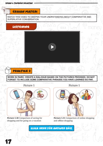 17 SMAN 6 TAMBUN SELATAN ListeningWATCH THIS VIDEO TO DEEPEN YOUR UNDRSTANDING ABOUT COMPARATIVE AND SUPERLATIVE CONVERSATION uraian materiPRACTICE 2WORK IN PAIRS. CREATE A DIALOGUE BASED ON THE PICTURES PROVIDED. DO NOT FORGET TO INCLUDE SOME COMPARATIVE PHRASES YOU HAVE LEARNED SO FAR.Click here for answer Quiz