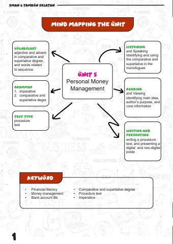 1 SMAN 6 TAMBUN SELATAN Vocabularyadjective and adverb in comparative and superlative degree, and words related to sequenceListeningand SpeakingIdentifying and using the comparative and superlative in the monologuesGrammar1. imperative 2. comparative and superlative degreReadingand Viewingidentifying main idea, author%u2019s purpose, and core informationText typeproceduretextWriting and Presentingwriting a procedure text, and presenting a digital and non-digital posteUnit 5Personal MoneyManagementMind Mapping the Unit%u2022 Financial literacy%u2022 Money management%u2022 Bank account Bb%u2022 Comparative and superlative degree%u2022 Procedure text%u2022 ImperativeKEYWORD