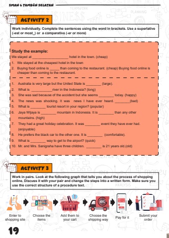 19 SMAN 6 TAMBUN SELATAN Study the example: We stayed at ___________________ hotel in the town. (cheap)1. We stayed at the cheapest hotel in the town2. Buying food online is _____ than coming to the restaurant. (cheap) Buying food online is cheaper than coming to the restaurant.1. Australia is very large but the United State is ________ (large).2. What is ___________river in the Indonesia? (long)3. She was sad because of the accident but she seems ________ today. (happy)4. The news was shocking. It was news I have ever heard. ________(bad)5. What is ________ tourist resort in your region? (popular)6. Jaya Wijaya is ________ mountain in Indonesia. It is ________ than any other mountains. (high) 7. They had a great holiday celebration. It was ________ event they have ever had. (enjoyable)8. He prefers the black car to the other one. It is ________ (comfortable).9. What is ________ way to get to the airport? (quick)10. Mr. and Mrs. Sanigraha have three children. ________ is 21 years old.(old)Work individually. Complete the sentences using the word in brackets. Use a superlative (-est or most_) or a comparative (-er or more)Work in pairs. Look at the following graph that tells you about the process of shopping online. Discuss it with your pair and change the steps into a written form. Make sure you use the correct structure of a procedure text.Activity 2Activity 3Enter to shopping siteChoose the itemsAdd them to your cartChoose the shipping way Pay for it Submit your order