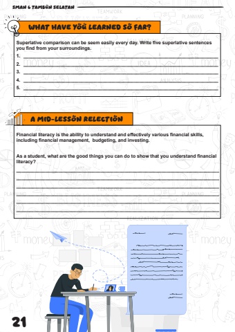 21 SMAN 6 TAMBUN SELATAN What Have You Learned So Far? A Mid-Lesson RelectionSuperlative comparison can be seem easily every day. Write five superlative sentences you find from your surroundings.1. __________________________________________________________________________2. __________________________________________________________________________3. __________________________________________________________________________4. __________________________________________________________________________5. __________________________________________________________________________Financial literacy is the ability to understand and effectively various financial skills, including financial management, budgeting, and investing.As a student, what are the good things you can do to show that you understand financial literacy?______________________________________________________________________________________________________________________________________________________________________________________________________________________________________________________________________________________________________________________________________________________________________________________________________________________________________________________________________________