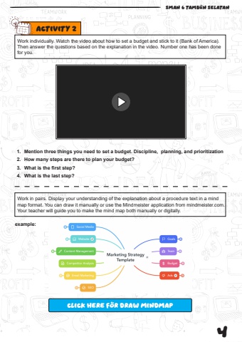 4 SMAN 6 TAMBUN SELATAN Click here for draw mindmap1. Mention three things you need to set a budget. Discipline, planning, and prioritization2. How many steps are there to plan your budget? 3. What is the first step?4. What is the last step?Work individually. Watch the video about how to set a budget and stick to it (Bank of America).Then answer the questions based on the explanation in the video. Number one has been done for you. Work in pairs. Display your understanding of the explanation about a procedure text in a mind map format. You can draw it manually or use the Mindmeister application from mindmeister.com. Your teacher will guide you to make the mind map both manually or digitally.Activity 2example: