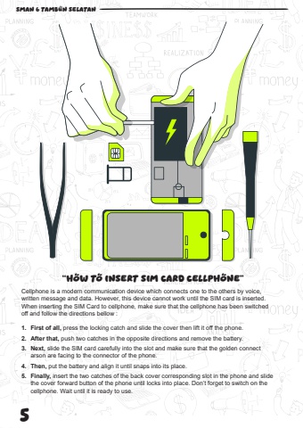 5 SMAN 6 TAMBUN SELATAN Cellphone is a modern communication device which connects one to the others by voice, written message and data. However, this device cannot work until the SIM card is inserted. When inserting the SIM Card to cellphone, make sure that the cellphone has been switched off and follow the directions bellow : 1. First of all, press the locking catch and slide the cover then lift it off the phone. 2. After that, push two catches in the opposite directions and remove the battery. 3. Next, slide the SIM card carefully into the slot and make sure that the golden connect arson are facing to the connector of the phone. 4. Then, put the battery and align it until snaps into its place. 5. Finally, insert the two catches of the back cover corresponding slot in the phone and slide the cover forward button of the phone until locks into place. Don%u2019t forget to switch on the cellphone. Wait until it is ready to use. %u201cHow to Insert Sim Card Cellphone%u201d