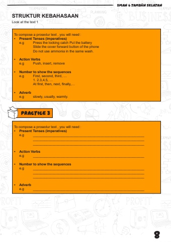 8 SMAN 6 TAMBUN SELATAN PRACTICE 3STRUKTUR KEBAHASAANLook at the text 1To compose a prosedur text , you will need : %u2022 Present Tenses (imperatives) e.g Press the locking catch Put the battery Slide the cover forward button of the phone Do not use ammonia in the same wash. %u2022 Action Verbs e.g Push, insert, remove %u2022 Number to show the sequences e.g First, second, third, %u2026 1. 2.3,4,5, %u2026 At first, then, next, finally,%u2026 %u2022 Adverb e.g slowly, usually, warmly.To compose a prosedur text , you will need : %u2022 Present Tenses (imperatives) e.g __________________________________________________________ __________________________________________________________ __________________________________________________________%u2022 Action Verbs e.g __________________________________________________________ %u2022 Number to show the sequences e.g __________________________________________________________ __________________________________________________________ __________________________________________________________ %u2022 Adverb e.g __________________________________________________________